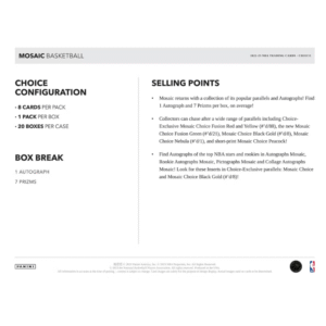 Get ready for an unparalleled collecting experience with the 2022/23 Panini Mosaic Basketball Choice Case! This edition is packed with the dynamic energy of the NBA, featuring a stunning array of base cards, vibrant parallels, and exclusive inserts. Don’t miss your chance to own a piece of the action—grab your 2022/23 Panini Mosaic Basketball Choice Case today and take your collection to the next level!