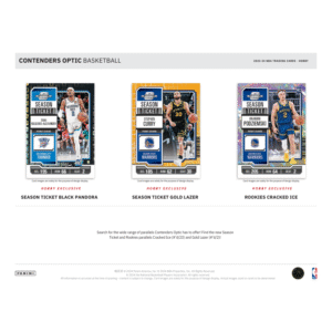 The 2023/24 Panini Contenders Optic Basketball Hobby Box delivers a premium collecting experience, combining the iconic Contenders design with a modern Opti-Chrome finish. Each box contains 6 cards, including 1 autograph, 2 inserts or parallels, and 3 base season ticket cards. Collectors can chase the highly coveted Rookie Ticket Autographs featuring the NBA’s top 2023 rookies, along with stunning parallels such as Gold Vinyl 1/1 and Cracked Ice. Look for new insert sets like Lottery Ticket and Uniformity, plus returning favorites like Superstars Die-Cuts and Optic Hall of Fame Contenders. With its sleek designs and rare autograph opportunities, Contenders Optic is a must-have for basketball collectors seeking both rookies and established stars.
