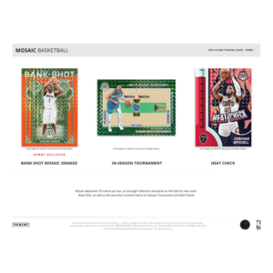 – Mosaic delivers 20 inserts per box, on average! Collectors should be on the look for new insert Bank Shot, as well as the new short-printed inserts In-Season Tournament and Heat Check!