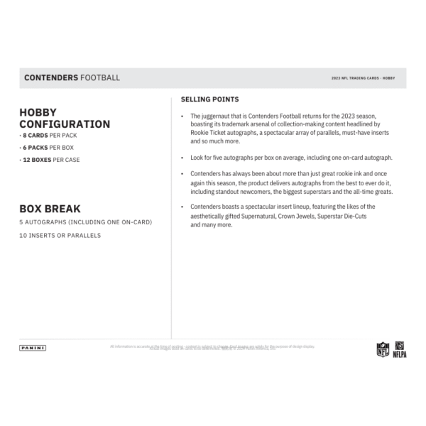- The juggernaut that is Contenders Football returns for the 2023 season, boasting its trademark arsenal of collection-making content headlined by Rookie Ticket autographs, a spectacular array of parallels, must-have inserts and so much more.