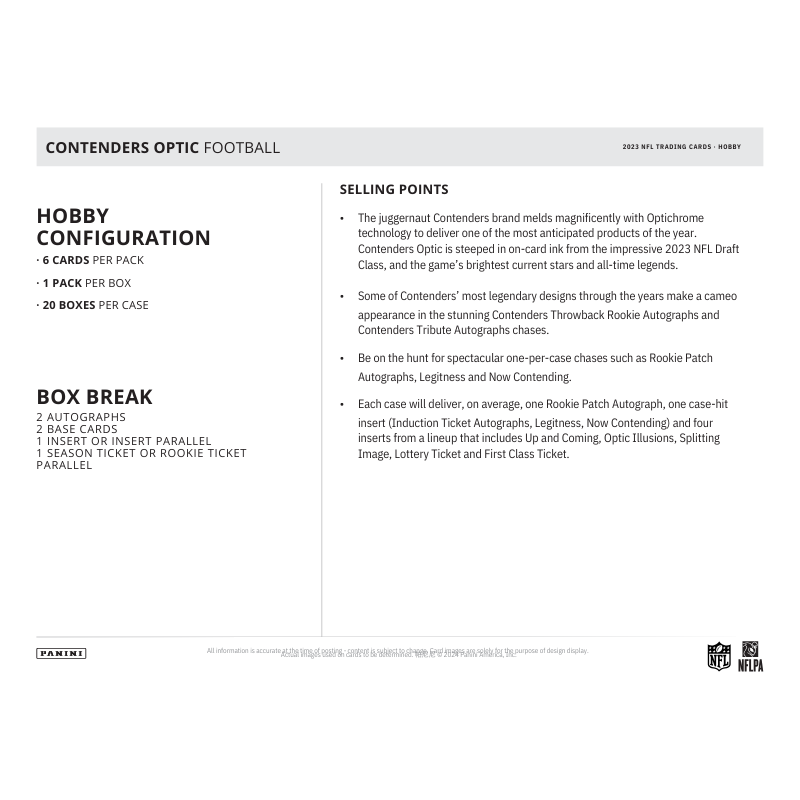 - The juggernaut Contenders brand melds magnificently with Optichrome technology to deliver one of the most anticipated products of the year. Contenders Optic is steeped in on-card ink from the impressive 2023 NFL Draft Class, and the game’s brightest current stars and all-time legends.