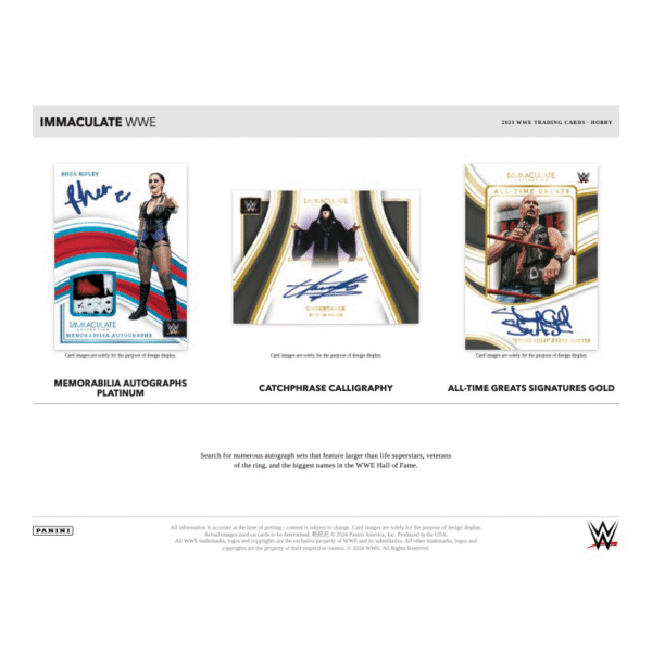 Get ready to rumble with the 2023 Panini WWE Immaculate Hobby Case! Averaging 15 autos and 10 memorabilia cards, this case is your ticket to scoring massive autographs, memorabilia cards, and those elusive 1-of-1s featuring WWE Superstars and Legends. Don’t miss out on the ultimate WWE collecting experience. Grab your 2023 Panini WWE Immaculate Hobby Case today!