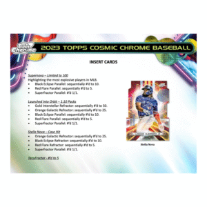 Explore the cosmic side of baseball with the 2023 Topps Cosmic Chrome Baseball Hobby Case. Enjoy dazzling cards, including an average of 4 autographs, plus 12 Nucleus Refractors and 24 extra Parallels per case.