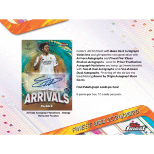 - Explore UEFA’s finest with Base Card Autograph Variations and glimpse the next generation with Arrivals Autographs and Finest First Class Rookies Autographs.