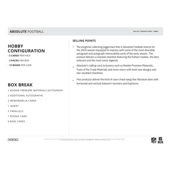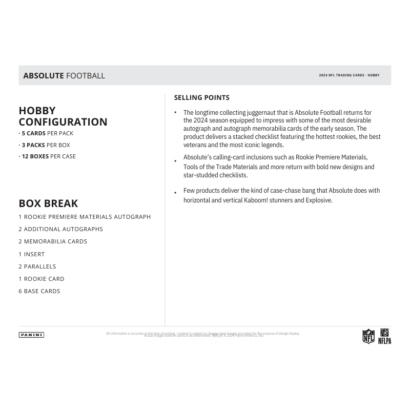 - The longtime collecting juggernaut that is Absolute Football returns for the 2024 season equipped to impress with some of the most desirable autograph and autograph memorabilia cards of the early season. The product delivers a stacked checklist featuring the hottest rookies, the best veterans and the most iconic legends.