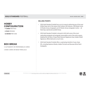 – 2024 Gold Standard Football lives up to its name by delivering one of the most brilliant base sets of the season that includes 100 veterans, 100 Rookie Cards, 42 Rookie Jersey Autographs and 42 Rookie Jersey Autographs Jumbo — all featuring a spectacular parallel lineup.