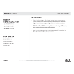 The 2024 Panini Mosaic Football Hobby 12 Box Case brings bold design and explosive action to collectors, featuring an array of NFL stars, rookies, and legends. Each box includes a stunning lineup of Mosaic parallels, autographs, and inserts, offering fans a chance to chase the iconic Silver Prizms and ultra-rare inserts like Stained Glass and Storm Chasers. Perfect for serious collectors and NFL enthusiasts alike, the 2024 Mosaic Football Hobby Case is packed with variety and premium content, making it a must-have in any football collection.