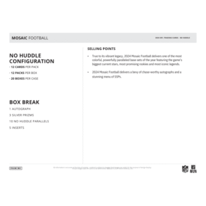 The 2024 Panini Mosaic Football No Huddle Box delivers a vibrant and collectible experience for football fans, featuring exclusive No Huddle parallels and inserts. Each box includes 12 packs with 12 cards per pack, offering a mix of stunning base cards, sought-after parallels, and rare inserts. Look for autographs from NFL stars and rookies, along with exclusive Disco variations unique to this format. With its bold Mosaic designs and chase-worthy hits, this box is perfect for collectors looking to add high-quality football cards to their collection.