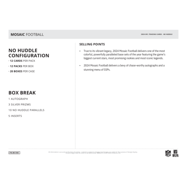 - True to its vibrant legacy, 2024 Mosaic Football delivers one of the most colorful, powerfully paralleled base sets of the year featuring the game’s biggest current stars, most promising rookies and most iconic legends.