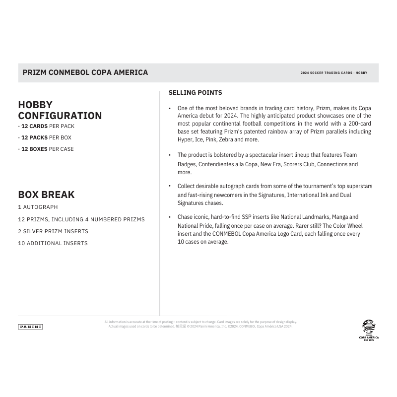 – The highly anticipated 2024 Prizm CONMEBOL Copa America showcases one of the most popular continental football competitions in the world with a 200-card base set featuring Prizm’s patented rainbow array of Prizm parallels including Hyper, Ice, Pink, Zebra and more.