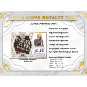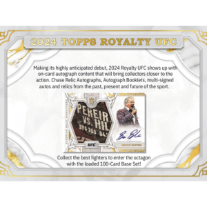 Step into the Octagon with the 2024 Topps Royalty UFC Hobby Box, a premium release celebrating the biggest names in mixed martial arts! This set features stunning designs, high-end parallels, and exclusive autographs from UFC legends and rising stars. Chase rare inserts, on-card signatures, and unique relic cards showcasing fight-worn memorabilia. With a mix of past, present, and future champions, this box is a knockout addition to any UFC collector’s lineup. Don’t miss your chance to pull the best—secure your box today!