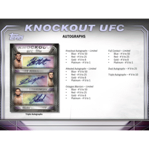 The 2024 Topps UFC Knockout Hobby Box delivers a powerful punch for MMA collectors, offering premium cards featuring the biggest names in the UFC. Each box includes a mix of autographs, memorabilia cards, and parallels, showcasing UFC champions, rising stars, and fan-favorite fighters. With bold designs and on-card autographs, collectors can chase rare hits like dual autographs, relic cards, and limited-edition parallels. The Knockout series is known for capturing the intensity and excitement of UFC action, making it a must-have for fans looking to add top-tier UFC content to their collection.