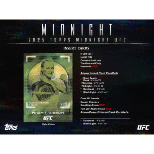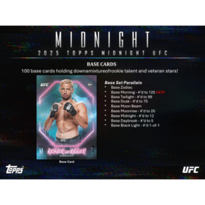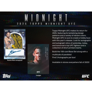 - Topps Midnight UFC makes its return for 2025, featuring its tantalizing design patterns and a variety of vibrant colors.